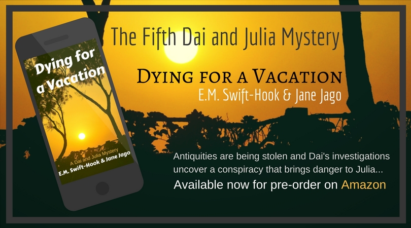 The Dai and Julia Mysteries are written by E.M. Swift-Hook and Jane Jago. Dying for a Vacation, the fifth novella in the series, is now available for pre-order and will be released on 31 March.