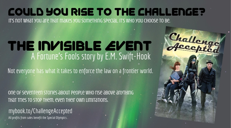 Challenge Accepted is an anthology of speculative fiction, featuring people with disabilities who rise to the challenge. You can enjoy the opening of The Invisible Event, which is a Fortune's Fools story by E.M. Swift-Hook.