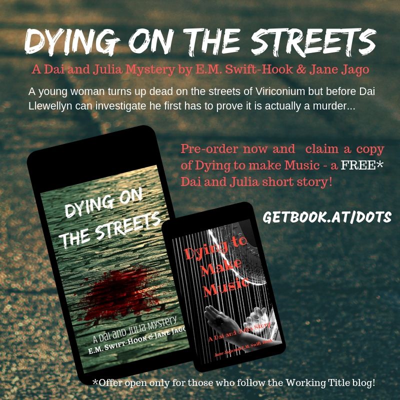 You can pre-order Dying on the Streets and, as a follower of this blog, if you show us you have done so we will send you a free ebook of Dying to Make Music – a bonus Dai and Julia short story!