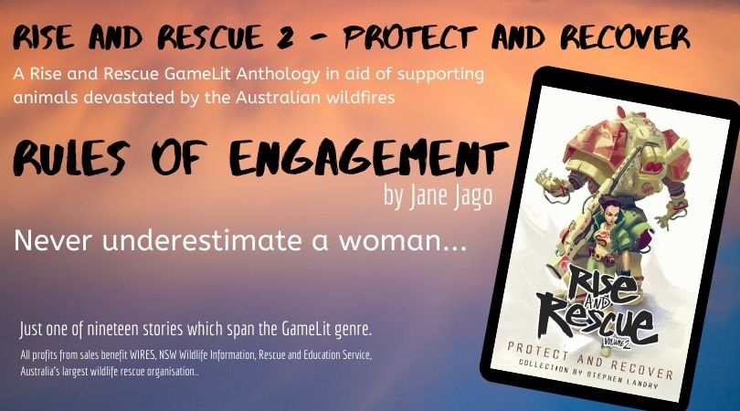 ‘Rules of Engagement’ by Jane Jago is one of nineteen Game Lit stories by as many authors in Rise and Rescue Volume 2: Protect and Recover. All profits from the Rise and Rescue anthologies will go to support wildlife devastated by the Australian wildfires.