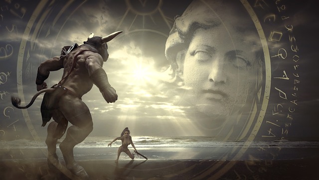 Hanna switched off everything except for the necessity to listen for the unlocking of the Minotaur’s cage. Ah. There was the quiet snick of the meticulously oiled lock. She ran as swiftly as her legs would carry her, so that she was just to the right of the doorway as the portcullis lifted. The beast wasn’t fast enough to avoid a debilitating cut to his left arm, he snarled and tried to toss the Morningstar into his right hand. But he missed the catch, and Hanna danced in for another slash of her sword, this time cutting the right bicep. With his arms weakened, Hanna had to bet that her adversary would try to bring his razor-sharp horns into play. She danced back, careful not to trip over the fallen spiked mace and the Minotaur howled his defiance before dropping his head for the charge. Hanna knew she she dare not let him get close enough to gore her with the poison-coated tips of his horns so she moved with speed and caution until she could approach the beast from his left hand side. He turned to meet her, shaking his great horned head in bewilderment, and she knew a moment of pity for the half beast. She hardened her heart, knowing that the creature was incapable of feeling pity for her, and in full awareness that he would kill her without blinking one muddy brown eye.