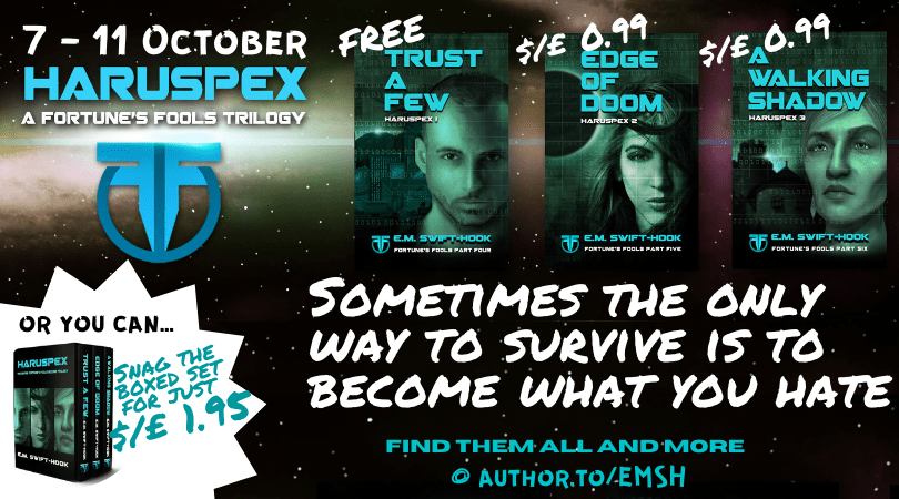 If you want to keep reading, Trust A Few by E.M. Swift-Hook is FREE to download until 10 May and you can pick up the other two books in the Haruspex Trilogy, Edge of Doom and A Walking Shadow for 0.99 each or snag the Entire Haruspex Boxed Set for just 1.95!