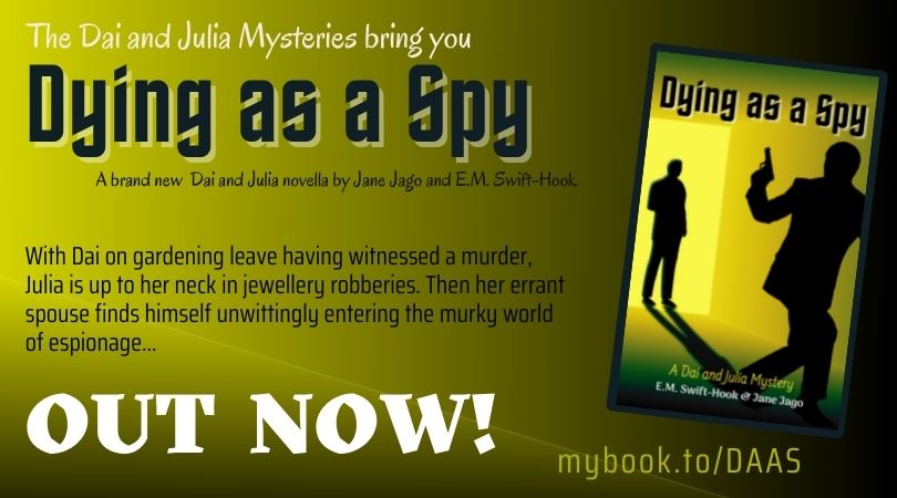 Dying as a Spy by Jane Jago and E.M. Swift-Hook is out today. Dai and Julia are back and in trouble again, this time tangling with jewel thefts and secret agents…