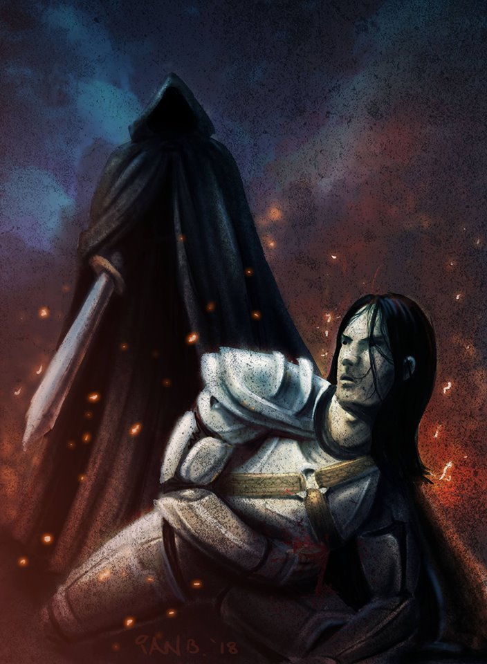 Dying might not be so bad. It was living that had broken him. Taken from his family at eight years old, vowed to celibacy before he understood what the word meant, and sold to the highest bidder time after time. His sword had eaten the blood of so many enemies that he felt today was no more than reparation. As the hooded figure came to his side he looked into its compassionate eyes.